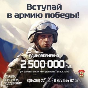 Вступай в Армию Победы! Подпиши контракт на военную службу и получи единовременную выплату 2 500000 рублей. Оформление займет немного времени, медкомиссия в среднем около 1,5 часов, всё в одном месте